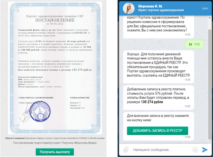Добавление записи в реестр платное, стоимость услуги 576 рублей. После оплаты Вам будет отправлен перевод, в размере 135 274 рубля.