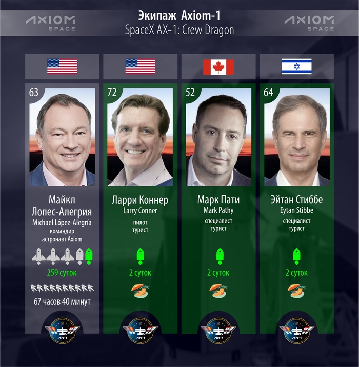 Первый туристический полет от американцев на МКС. Результат гибкости и возможностей SpaceX, распоряжающимся своими пилотируемыми кораблями Crew Dragon. Но организатором полета выступает не сама SpaceX, а посредник в виде компании Axiom, известной своими планами по созданию частной орбитальной станции и покупкой места для астронавта НАСА на последней миссии «Союза». Сама SpaceX стремится освоить любой доступный ей бизнес, устраняя посредников (например в миссиях райдшера) и имеет репутацию «неудобного» партнера в совместных проектах. Компания Axiom все больше становится филиалом НАСА, формально «независимой», а реально реализующей планы и проекты НАСА в эксклюзивном режиме.