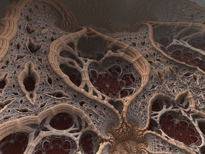 Много фракталов можно указать в организме: глядя на ветвящиеся бронхи в легком или на сплетение кровеносных сосудов, тоже нельзя сказать, каков масштаб рисунка: фрагмент верхнего рисунка, будучи увеличен (нижний рисунок), выглядит точно так же. Самое же главное для организма - даже не фрактальные структуры, а тот фрактальный процесс клеточных делений, каким предстаёт онтогенез. В частности, весьма вероятно, что мозг столь сложен при столь малом числе генов потому, что в генах записаны не его связи, а параметры фракталообразующих правил онтогенеза.