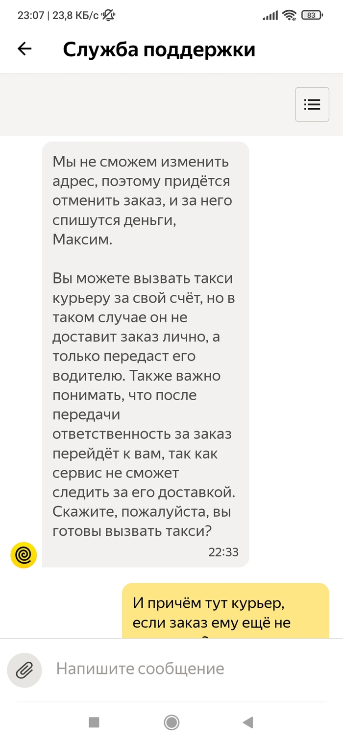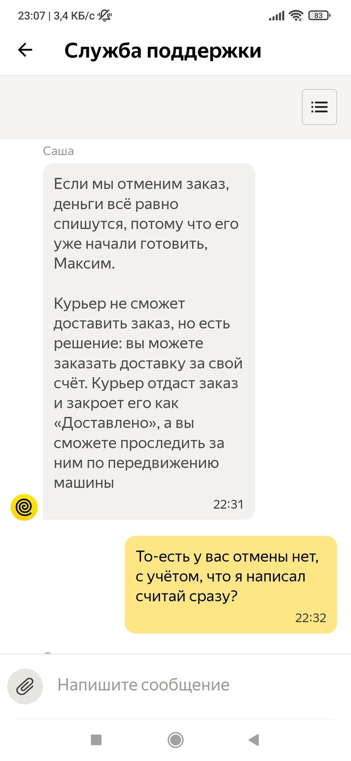 Хочу рассказать про мой опыт отмены заказа через Яндекс.Еду. Для ЛЛ - отмены нет! Сегодня решил заказать поужинать, так как готовить долго. Заказал еду, но сразу понял, что приложение автоматом указало мой рабочий адрес, а не домашний. Надо было отменять заказ, уже настроился выплатить неустойку за отмену. Из кнопок только - связаться с поддержкой. Сразу написал им. Скрины прикладываю. Заказ был в 22.23.