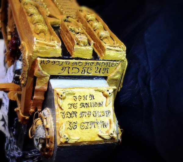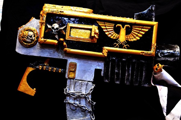 Материалы: гипс Г16 - практически все украшения выполнены из него (По причине веса. При использовании «эпоксидки» болтер весил бы 10 кг), кожа (рукоять), шпатлевка, багет (обрамление), металлическая цепь, пол года боли.