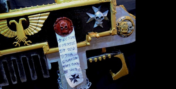 Аквилла :Болтер Мордреда украшен острогранной аквиллой, что символизирует собой суть характера Чёрных Храмовников – вспыльчивый и нетерпимый к врагам Империума.