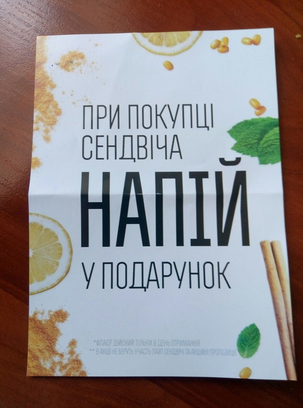 Иду на работу. По улице возле метро. людей много. Студенты-школьники раздают флаера. С криком "Лимонад в подарок!" Девочка тычет мне листовкой. Взял. Прошел толпу народу и решил глянуть.