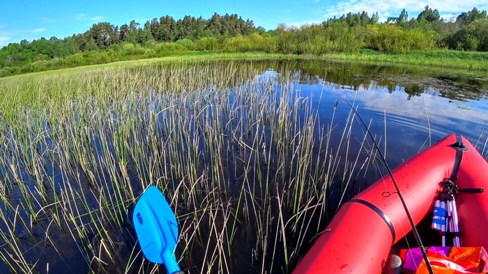 Решение было принято после нескольких всплесков, характерных для щучьих атак. Вообще ловля по траве очень увлекательна и азартна так как приманка идёт по верху и щука часто выпрыгивает из воды в попытках её поймать. Но сегодня удача явно не на моей стороне и добился я лишь нескольких поклевок.