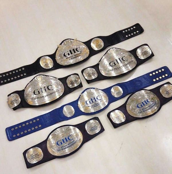 Перейдём к чемпионским титулам этого промоушена. По дизайну все титулы напоминают друг друга, только полутяжеловесные пояса меньше размером, располагаются на синем ремешке и буквы на титуле синего цвета. Кроме того, в названии каждого титула присутствует обозначение GHC, что расшифровывается как Global Honored Crown.