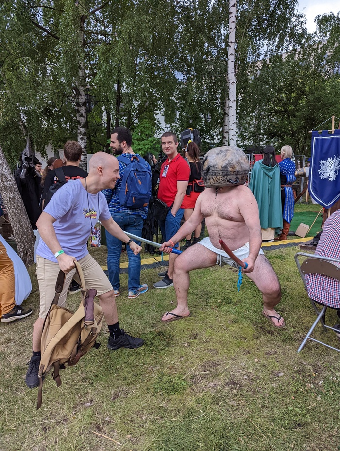 Герой из Elder ring, который убивает сильнейшего боса в одиночку и не носит брони. Забавно, но из-за кастрюли на голове косплеер почти ничего не видел, и его под руку водила жена или подруга)