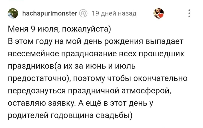 P.S. Все заявки принимаются в комментариях. Желающие быть повторно поздравленными могут также оставить свою заявку.