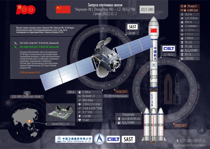 Сегодня, 9 сентября в 19:50 BJT (11:50 UTC), с космодрома Сичан (провинция Сычуань, КНР) успешно выведен на геопереходную орбиту, при помощи ракеты-носителя CZ-3B/G2 (Y86) / Chang Zheng 3В/G2, телекоммуникационный спутник связи "Чжунсин-9B" (ZhongXing-9B).