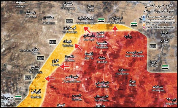 Полным крахом стало анонсированное боевиками наступление вблизи города Дараа. Умеренные начали свою атаку, захватив заброшенную военную базу, блок пост и три фермы, чтобы сажать ростки демократии перерезать дорогу Дамаск-Дараа. Однако выехавшая пожарная команда зачистила прорыв, убив по меньшей мере 10 боевиков, 2-х полевых командиров, уничтожив танк и 2 тачанки. (в твитерах пишут о 20-80 убитых и 60 раненых боевиках, и 3х подбитых БМП со стороны САА). Посмотрим будет ли продолжено наступление на этом участке.