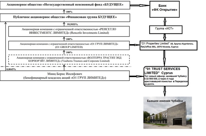 А теперь возвращаемся к негосударственному пенсионному фонду «Будущее», принадлежащему тому же господину Минцу. Итак, вырисовывается весьма удивительная картинка, соединяющая воедино непосредственно АО «НПФ «Будущее» Минца и тот самый дворец в Переделках, который возводился для Анатолия Чубайса.