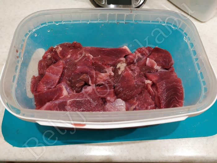 Оставшееся мясо, свинина и говядина нарезается кусками под мясорубку и так же солятся отдельно друг от друга посолочной смесью 2-3 суток в холодильнике.