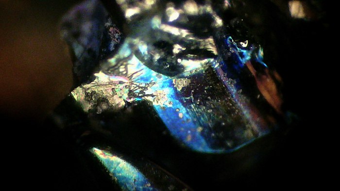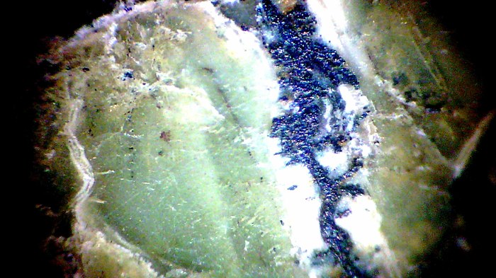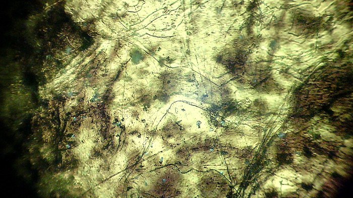 Фото №1 - Азурит ((CuCO₃)₂·Cu(OH)₂) под микроскопом. Увеличено в 64 раза. Легко определяется по хим. реакциям с кислотами и аммиаком, где он растворяется и придаёт раствору голубую окраску;