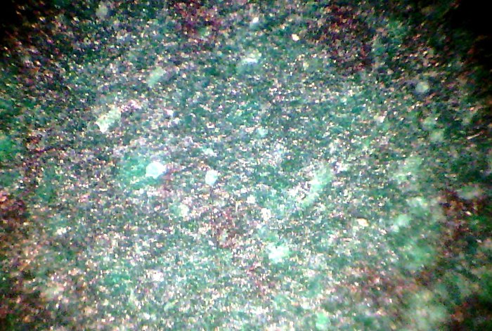 Фото №14 - Малахит (Cu₂CO₃(OH)₂) под микроскопом. Увеличено в 64 раза. Хорошо диагностируется по взаимодействию с кислотами и низкой твёрдостью;