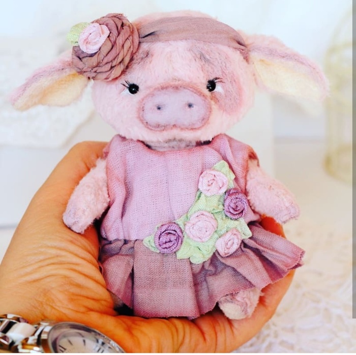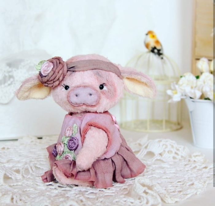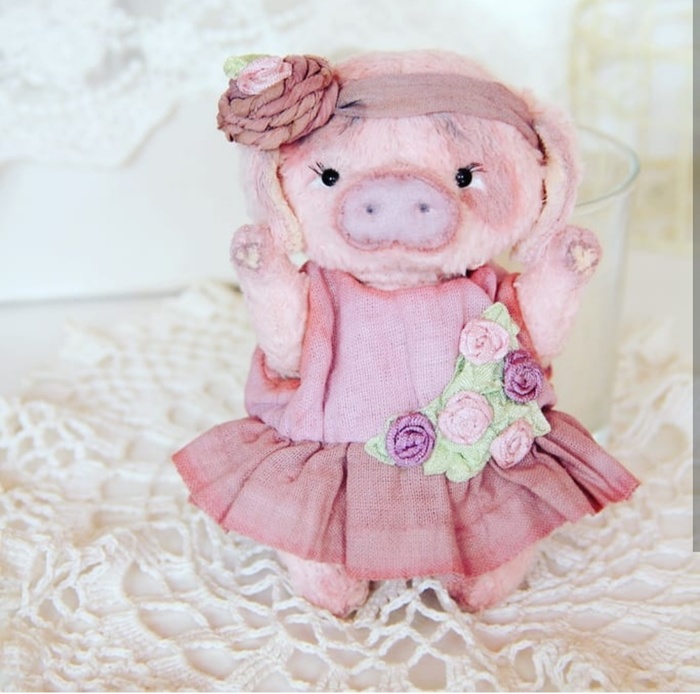 Этой самый первый поросенок. Она малюська, когда сидит - 10 см. Одежду придумала и смоделировали сама, винтажный стиль - тоже, люблю также и шебби-шик. Реснички-тоже теперь всем делаю, так они прямо девочки-девочки) Живёт у меня дома, вдохновляет)
