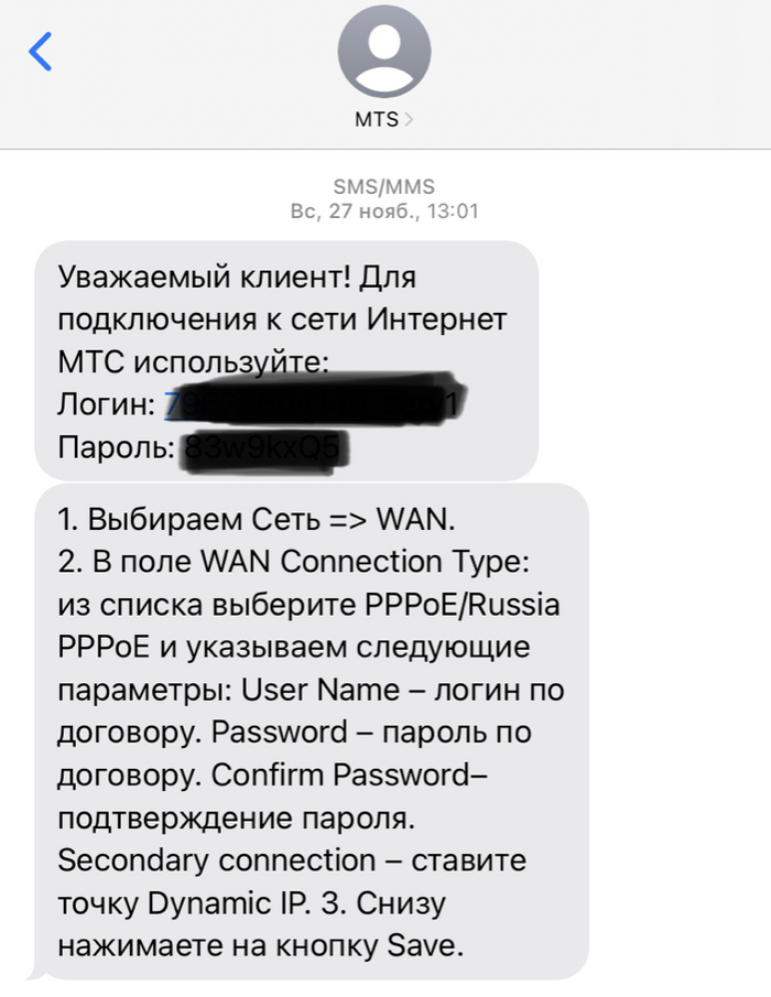 Звонок в службу поддержки, объяснение ситуации. Здесь я звонил уже сам, и сквозь помехи и отчаянную картавость оператора, очень быстро получил нужную мне информацию в виде СМС. Ко всему прочему, человек спросил у меня модель роутера, и тут же прислал пошаговую инструкцию для его настройки. Вот конкретно этому специалисту хочу еще раз высказать огромное спасибо, так быстро и просто решить вопрос - потрясающе. К примеру, я не знал, что для повторного подключения нужно выбрать пункт Dynamic IP.