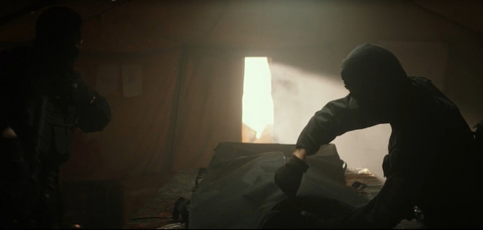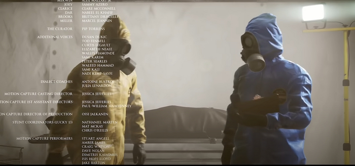 Игра: Два человека в защитных костюмах и с закрытыми лицами обследуют мешок с трупом прямо в титрах.