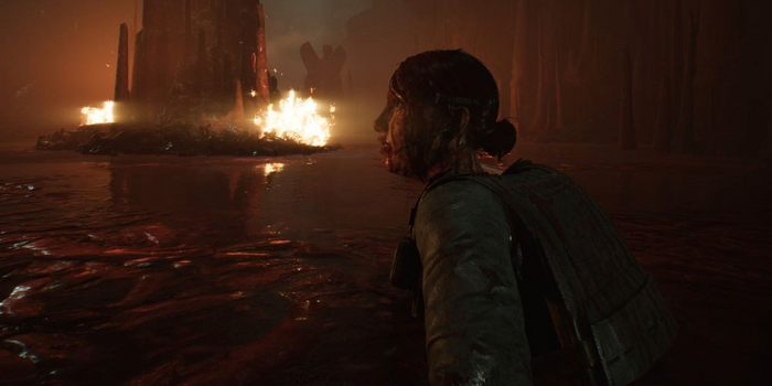 Игра: Героиня падает вниз и оказывается в кровавой яме (тоже не самой чистой), где и скрывается от преследования. Темно-красная цветовая гамма также присутствует.