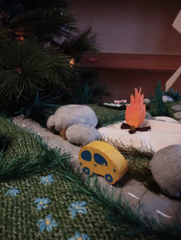 По этой дороге мы с вами попадаем в волшебный мир игрушек. Пройдём чуть вперёд и перед нами откроется вид на небольшой пляж с костром. Погреемся у огня?