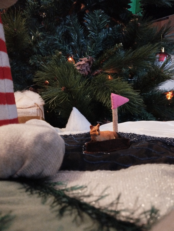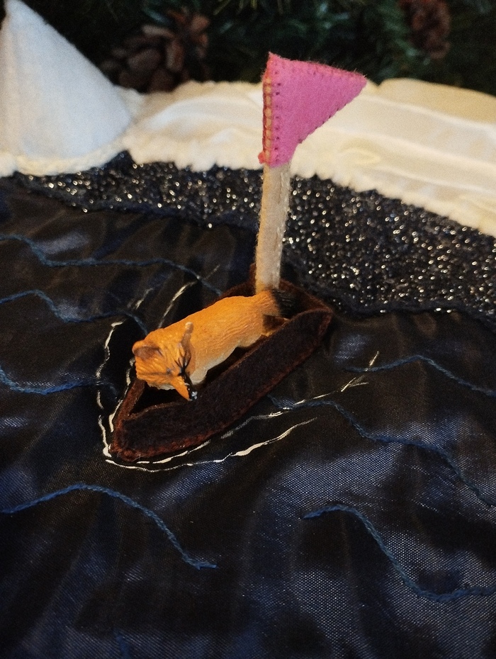 Мистер Лис решил воспользоваться лодкой и плывет куда-то. Возможно тоже в фетровый лес, на Новый год.