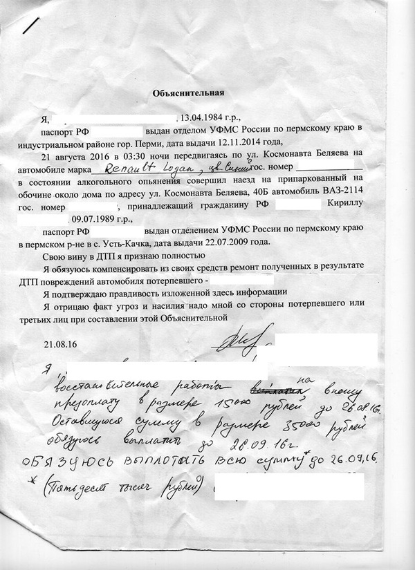 "Водитель Иванов И.И. признал свою причастность к данному происшествию и отдал предоплату Петрову П.П. на ремонт автомобиля ВАЗ-2114...."