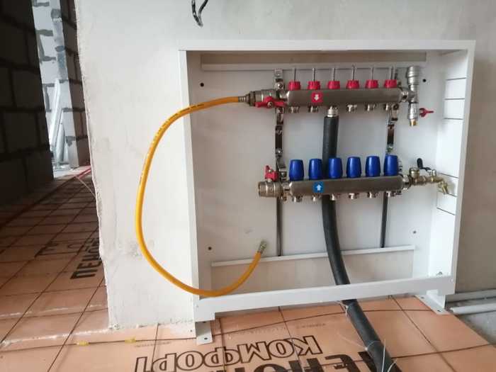 на фото самый первый нами проложенный контур, всего их в квартире будет 5, контуры примерно равны по 55 метров, только в детской получилось около 63, долго думали как быть, на два получится очень маленькие контуры, а один вроде большой, но решили на край повесим там батарею. Свободный контур в коллекторе остался. Кстати добавили в коллектор на обратку так же воздухоотводчик.