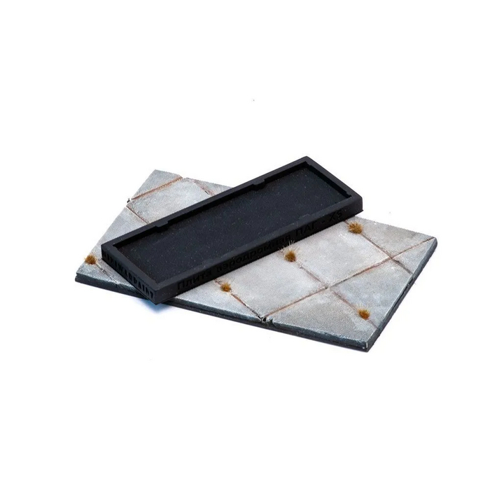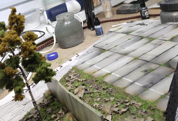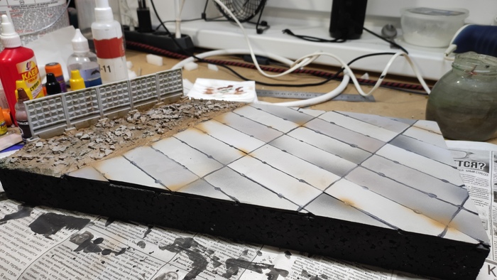 Налепив что-то около сорока плит, раскидал их по поверхности, склеил скотчем, перевернул, канцелярским ножом нацарапал и отколол лишнее. Замазал всё дешевым аналогом "Титана" из фикспрайса, приклеил плиты к нашей "земле". Гипсовый лом из того, что оставалось от работы насыпал на необлагороженную территорию, залил пва - пущай приклеивается. Прикинул хуй к носу как поставить забор, воткнул основания. Получилось... Да криво, блять, получилось, будто мне руки с ногами местами поменяли. Плиты на разной высоте, потому что поленился изготовить еще 30 плит, чтобы они были одинаковой толщины. Да, убирать излишки гипса с заготовок я догадался не сразу, и понадеялся, что смогу потом сыграть на толщине клея. По итогу, жизнь предложила мне сыграть на кожаной флейте... Да и хуй с ним, решил я, и начал воплощать в жизнь типа давно заброшенный аэродром, у которого от времени повело плиты, всё поросло травой, бомжи уже поставили палатки и их доедает медведь.