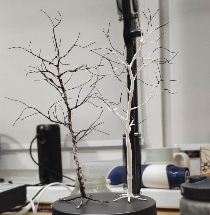 Деревья делал по гайду, найденному на Ютубе, ссылку вставлять, пожалуй, не буду, а то накидают мне хуёв в панамку за ссылку на тытрубу. Сначала дербаним провод, крутим ветки по принципу 3-2-1-жила, лохматим их, стрижём крону ножницами, красим кончики в черно-коричневый, намазываем пятна на ствол - основа есть. Губки драл старым блендером, сразу смешивая с краской. Пока получилось довольно топорно, в будущем планирую добавлять больше оттенков в листву, чем, блять два, лол. По-хорошему, красить надо в большее количество цветов, крошить мельче, подкрашивать на готовом. Но я рукожоп, мне пока и так сойдёт.
