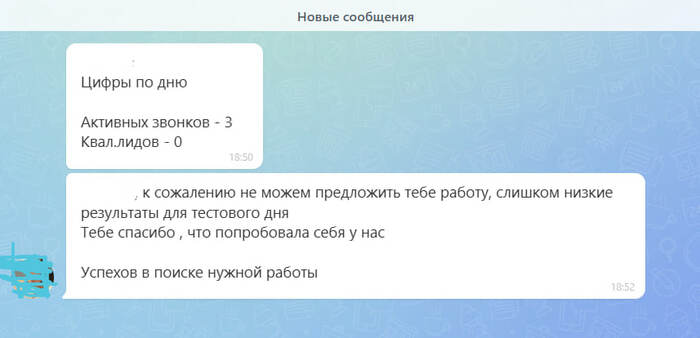 Задаю вопрос руководителю возникший в процессе работы, ответ пришёл, внимание, через 2 часа. Далее позвонив ещё где-то 20 лидов к концу дня руководитель скидывает отчёт. И говорит вы нам не подходите, т.к вы не очень показатели на тестовом дне. Просто написал и даже не созвонился.