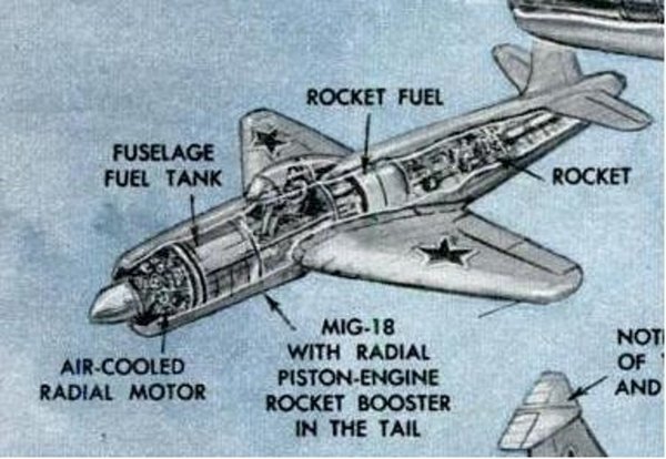 Лидером по созданию вымышленных самолётов стал журнал «Популярная механика». Одной из первых жертв ПМ стал истребитель МиГ-18. Что легло в основу этого шедевра американские «конструкторы» не уточнили, хотя схема получилась любопытная – четыре пушки, поршневой двигатель да ещё и ракетный ускоритель.