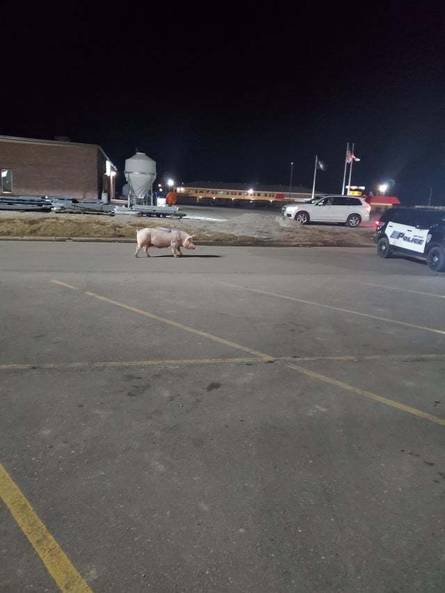Во время моей рабочей смены в Валмарте, эта свинья неожиданно появилась на нашей парковке.