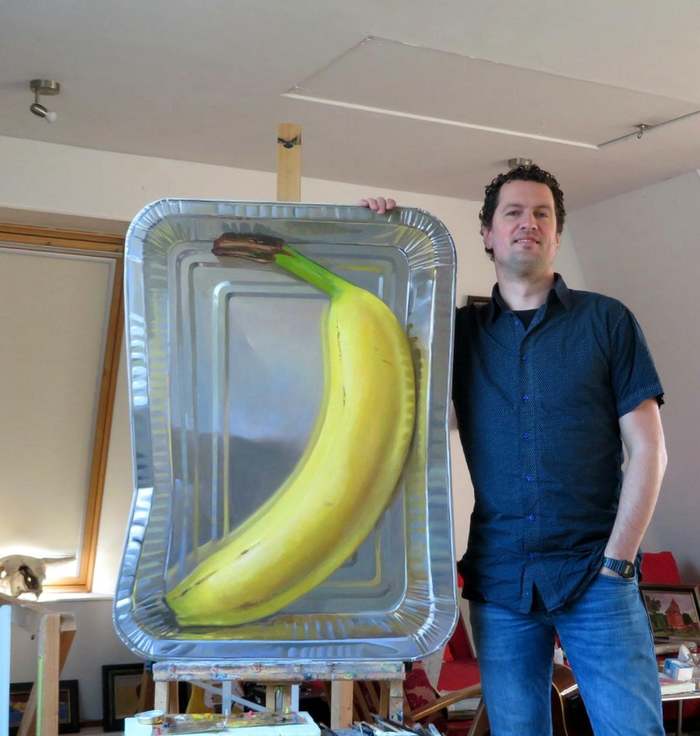 Я нарисовал банан в алюминиевом контейнере. Масляные краски на плоской (но не прямоугольной) панели, закончил сегодня.