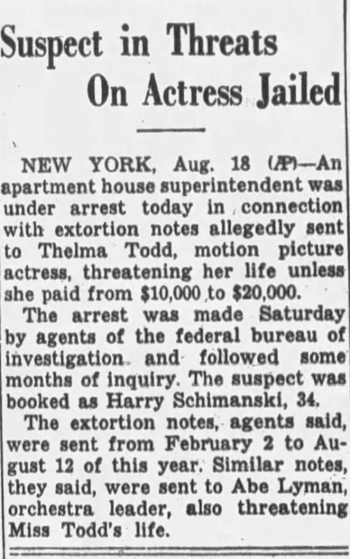 Некоторые письма были отправлены человеком по имени Гарри Шимански. Гарри угрожал ее жизни, если она не даст ему деньги. Он был арестован в августе 1935 года.