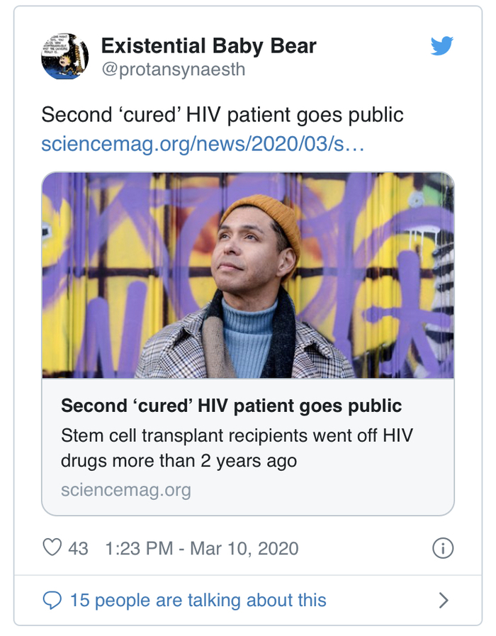 Год назад сообщалось, что второй пациент с начала распространения ВИЧ-инфекции может быть излечен от вируса. Так называемый «лондонский пациент», имя которого не разглашалось, мог стать вторым человеком после «берлинского пациента» Тимоти Рэя Брауна, которого удалось излечить от ВИЧ-инфекции 13 лет назад. Обоим пациентам была проведена трансплантация донорского костного мозга.