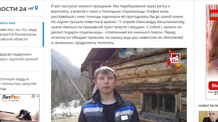 Одновременно ее попытались убедить перебраться поближе к людям, ведь еще зимой Агафья Лыкова неважно себя чувствовала. Однако отшельница, состояние которой, по ее словам, улучшилось, отказалась уехать, несмотря на все уговоры прибывшей навестить ее племянницы из старообрядческой деревни Килинск. Этот вертолёт и забрал помошника Александра Бессштанникова – ему пришла повестка, в которой говорилось, что Александру нужно явиться в военкомат 11 апреля. Перед отлетом Саша пообещал приехать к отшельнице после службы и продолжить помогать. С собой он увёз подарок отшельницы - сплетённый её именной поясок. К слову, как сказал еще один житель заимки - бывший геолог Ерофей Седов, за два месяца пребывания молодой послушник наготовил дров на три зимы вперед.