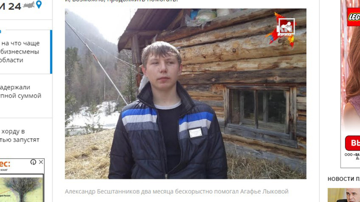на заимке Агафьи Лыковой в 2014 году два месяца заготовлял дрова 18-летний Александр Бессштанников, старообрядец, житель села Гарь Асиновского района Томской области,