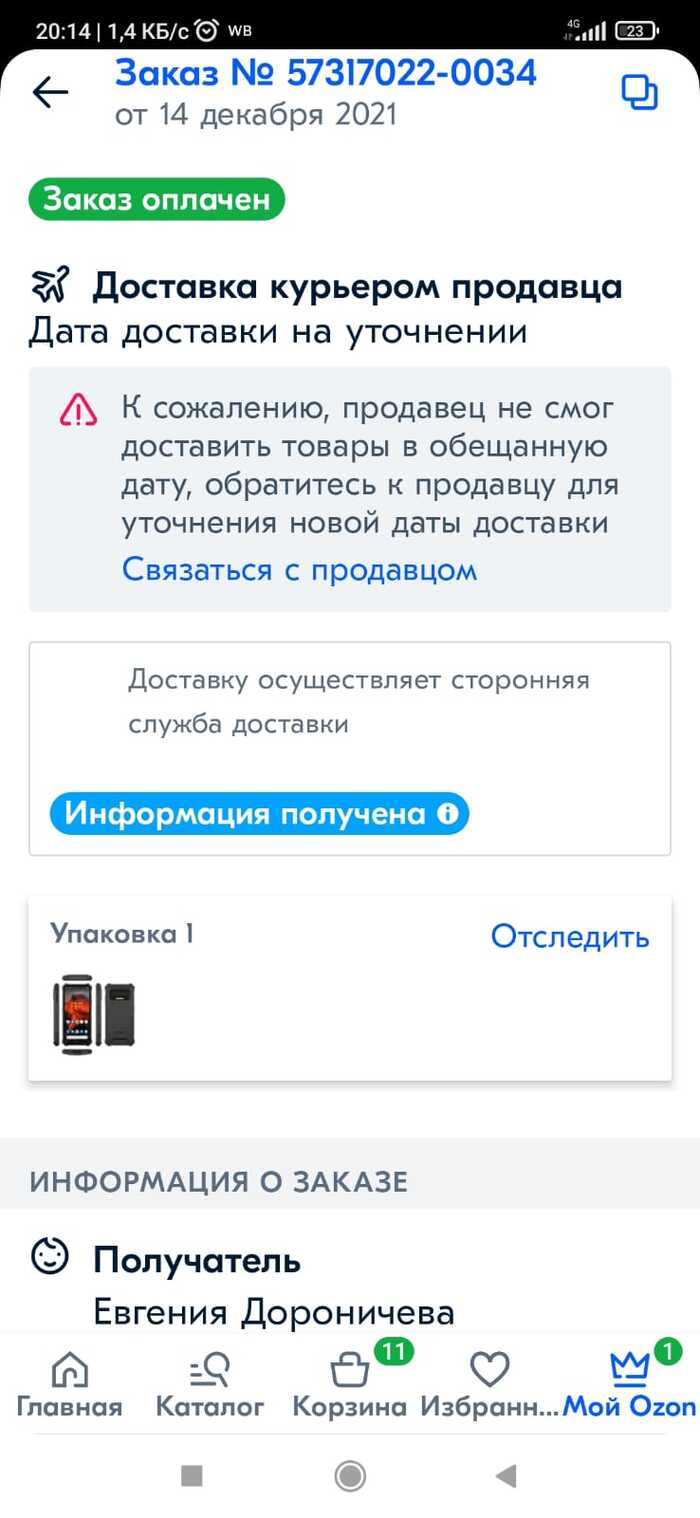 Заказала телефон на Озон 14 декабря 21г, продавец ТОРЗС.