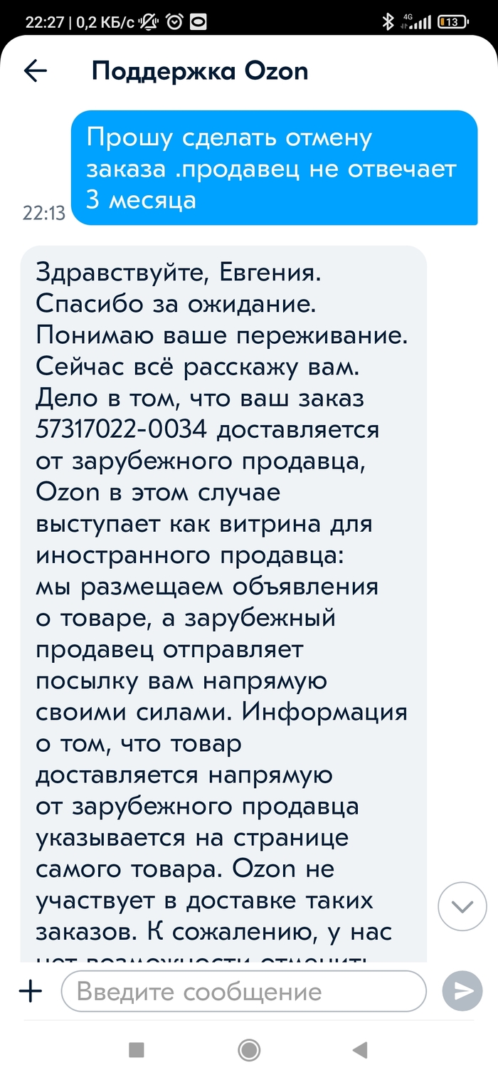 Трек не отслеживается, продавец молчит уже 3 месяца. Озон продлевает срок доставки уже 3й раз, служба поддержки пишет что не может сделать отмену заказа т. к доставку осуществляет сторонняя служба.
