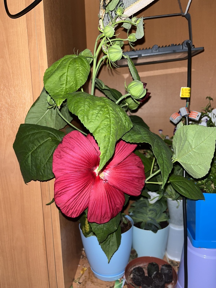Гибискус "Медовый месяц". Посев 25 декабря, грунт - чистый кокос, удобрение - Osmocote Exact Standard 5-6 мес. В воду для полива добавляю Hesi SuperVit. Освещение - светодиодный прожектор 50 ватт, 6500К. Как видно, растение уже настолько большое, что давно стало выше прожектора, но даже так, стоя сбоку и получая мало света, всё равно радует цветением)