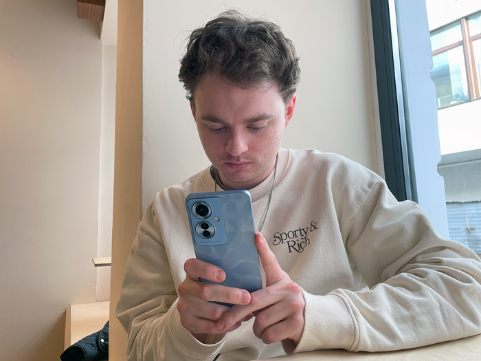 OPPO Reno11 F тонкий, с приятными квадратными гранями, удобно ложится в руку и мало весит — быстро достать его из кармана, чтобы сделать тысячную по счету фотку, проще простого.