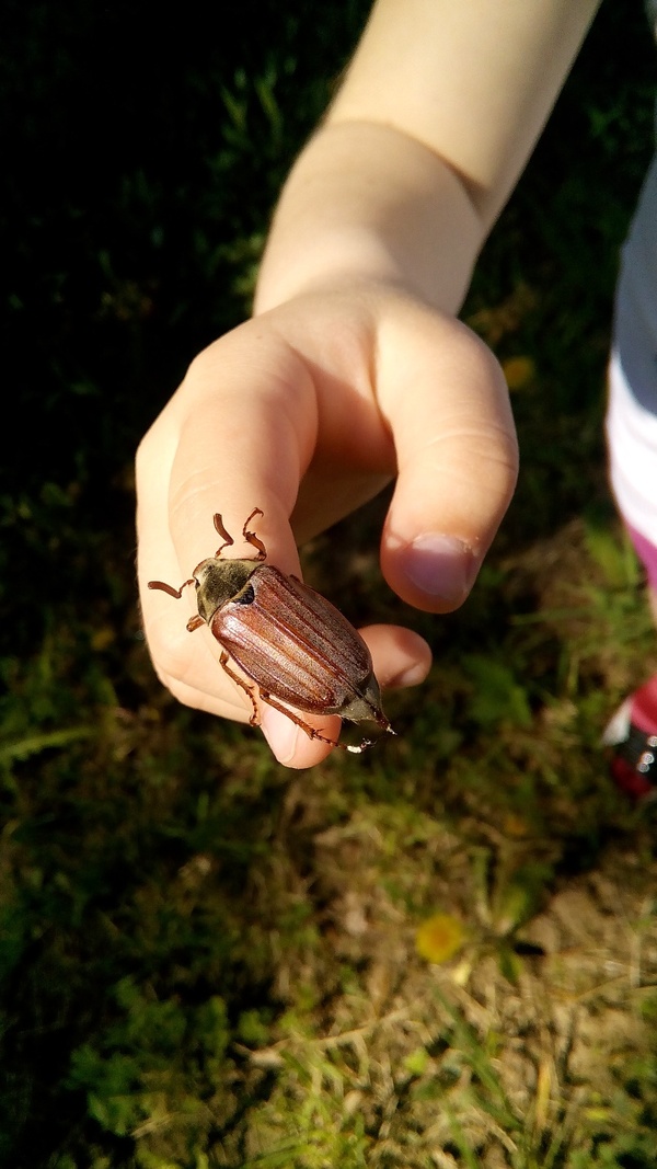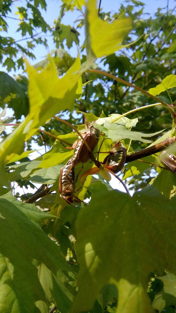 Подхожу я с дочкой и племяшом поближе и охреневаю от увиденного. Люди, человеки, господа!!! 29 лет топчу землю грешным своим 46 размером, а такого чуда ни разу не видывал. Жуков майских тьма тьмущая! Да по 5-6-10 штук на листочке-веточке. Висят аки гроздья винограда и делами непотребными занимаются