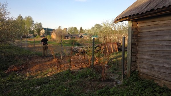 7 мая мы приехали, и на мой очередной вопрос, когда же наконец свершится чудо, и сарай будет разобран, сосед снова невнятно пробурчал, что у него нет времени. Тогда я громогласно заявил, что вызову трактор и просто сгребу этот сарай на его участок. В этот момент вышла соседка, владелица сарая (сосед ее сожитель, бесправный по сути), и начала орать на меня "как вам не стыдно, мы у вас прибирались, выкашивали" и в том же духе. На резонный ответ, что я их этого делать не просил, и вообще, по какому праву они хозяйничают на МОЕЙ земле, пошли какие-то невнятные отмазы типа "из травы гады всякие лезли". Поясню. В их понимании гады - это безобидные ящерицы длиной чуть больше указательного пальца взрослого мужчины, каковых полно в средней полосе. В этот момент вышла моя супруга и включилась в споры и крики. МЫ пригрозили юристом, на что были посланы в пешее эротическое путешествие. Так как это село, то на вопли взрослых высыпали из дома соседские дети (17 и 10 лет). Когда я от избытка чувств начал переходить на русский и могучий, соседка завизжала "ты как при моем ребенке разговариваешь!", хотя сама не стесняясь матерится в обычной обстановке. На что получила в ответ "а какого хрена твой ребенок сюда вообще вылез? Как хочу, так и разговариваю!". Далее пошли аргументы "у нас пахота на носу, времени нет, дел по горло, вы не предупредили, что забор будете ставить, мне сорок лет, я 20 лет тут живу". В общем, предварительно сошлись на том, что сарай мы с соседом разберем вместе, а кирпич он сам уберет. За весь день, что мы там были, сосед опилил 2 куста (30 минут времени), остальное время скрывался в доме. Трактор пахать к ним так и не приехал, в общем - бездельничали. Снова мы поехали доделывать ворота и начинать зашивать забор (что смогли поставить) 9 числа. По приезду нас ожидал сюрприз - сосед начал разбирать сарай! Сам! Скромно предложил мне помочь ему, я согласился, но с условием, что как только свои планы выполню - приду к нему. Короче. Мои друзья занялись воротами, меня делегировали на сарай. Разобрали мы его вдвоем с соседом за 2 часа. 2 часа, Карл! Ну, один он бы его 4 часа разбирал. И из-за этого они трахали нам мозги больше года! На фото - 4 столба, которые мы поставили на месте бывшего сарая (его фотки нет). Один из этих столбов я как раз крашу.