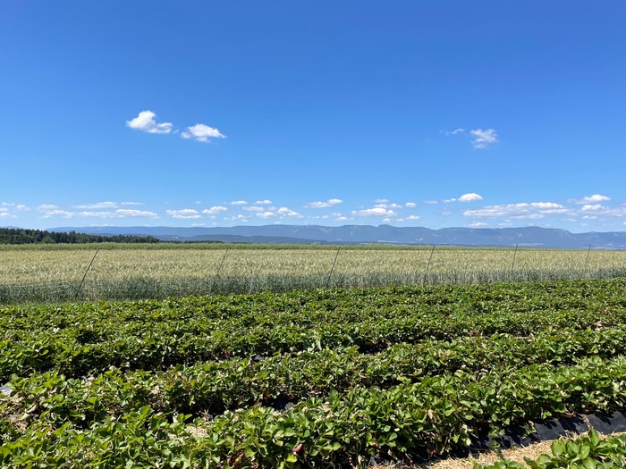 Ряды клубники на переднем плане. На заднем фоне - горный массив Юра.