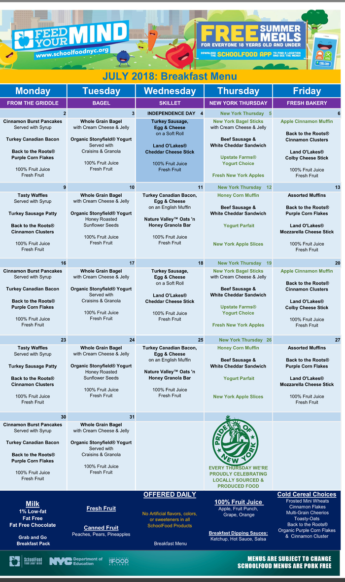 Нью-Йорк, бесплатные ланчи и завтраки для детей