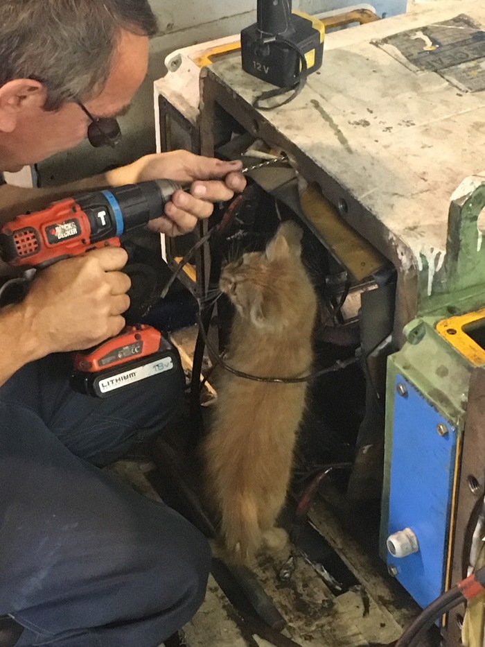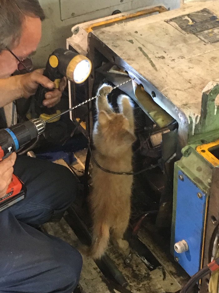 Сердце у всех дрогнуло,решили забрать к себе. Первый день ходил от всего шарахался,потом маленько привык.Сразу был выстиран,орал и вырывался как мог,но победила сила. Потом,когда его вытирали в отместку обоссал стиравшего. Теперь,по прошествии недели можно сказать-прирожденный слесарь))) всем помогает,ко всем лезет помогать. С огромным удовольствием ловит искры от отрезной машинки,грызет удлинитель,шланги от сварочного полуавтомата. При попытке дать по жопе убегает с задранным хвостом.Лоток освоил на ура,поставили за гибочным станком,показали один раз и все!!! Галопом несется к лотку. Стал спать при работающем оборудовании,даже гильотинные ножницы не могут разбудить. Короче говоря,кот выросший в слесарном цеху на пылесос смотрит как на говно). Будем растить,посмотрим что вырастет. Всем удачи.