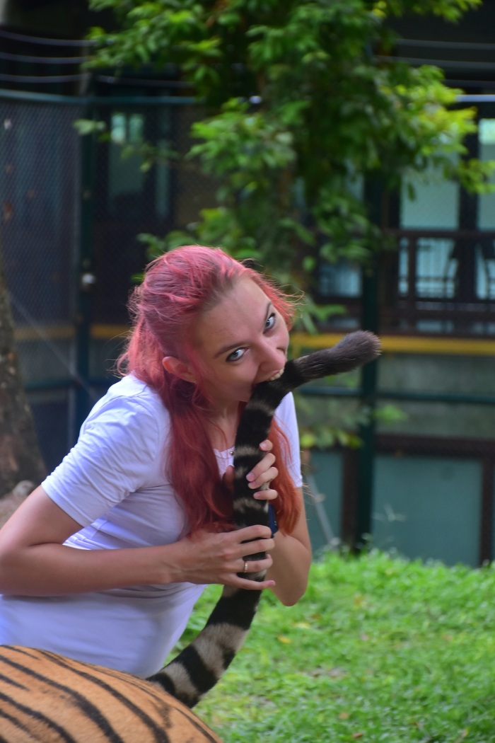 На удивление тигры как то индифферентно относятся к своему хвосту, в отличии от кошек, ну грызть его я, конечно, не рискнула, но фотка в стиле "смотри, я кусаю тигра за хвост" в топе моей личной коллекции