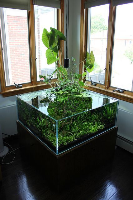 Неглубокий аквариум открывает новые возможности для творчества. Декорации, такие как коряги, камни и растения, могут быть преднамеренно расположены частично над водой, чтобы добавить в водный мир новое измерение. Многие аквариумные растения предпочитают расти над водой, а большинство из них и зацветает только в надводном состоянии. Если аквариум расположен относительно невысоко, то акваскейп можно легко рассматривать сверху, придав ему более естественный вид прудика или болотца. Мелкие аквариумы также легче в обслуживании. Используя более длинные пинцеты и ножницы, можно выполнять обрезку, не замочив руки! Поскольку мелкий аквариум имеет большую длину и ширину, он обладает большей площадью поверхности, что важно для насыщения кислородом.
