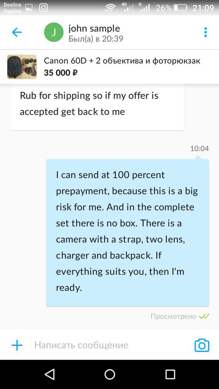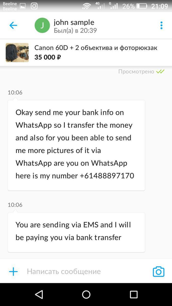 Во-первых, зачем австралийцу искать фотоаппарат на российских досках объявлений для пересылки в Эмираты? Во-вторых, John sample… серьезно? В плане психологических уловок, тут расчет на интерес к общению с англоговорящим покупателем, которого не пошлют при первом подозрении, во-вторых объяснение замороченного способа оплаты, в-третьих, повышенное доверие к “господину из цивилизованной страны”, который кидать не будет.