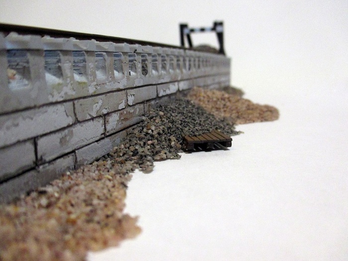 Все довольно просто в изготовлении: сначала печатаем эстакаду, шкурим, грунтуем, художественно старим, прикрепляем рельсы и дальше начинаем так же художественно оформлять травой, песком, щебенкой и другими макетными прелестями ;-)