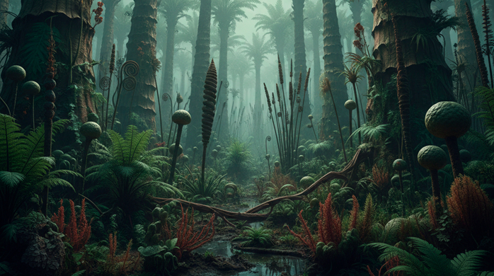 Вы очнулись в раннем девоне, 400 миллионов лет назад. Большую часть планеты покрывают мелководные моря, тогда как суша — в основном каменистые равнины и горы, изрезанные многорукавными реками и иловыми отмелями. Земля находится в состоянии перехода. Около ста миллионов лет жизнь постепенно разрушает породы в почву — мягкий слой, позволяющий расти растениям и процветать жизни. Озоновый слой медленно нарастает, подпитываемый газами, которые выделяют организмы. В последнее время этот процесс ускорился. Суша превращается из токсичной в полуобитаемую. Небо выглядит как-то «не так». Солнце сияет жёстким белым светом, едва фильтруемым непривычной атмосферой. Воздух кажется разрежённым: кислорода всего около 15 % против сегодняшних 21 %. Каждый вдох — неглубокий и неудовлетворительный. Вы на грани обморока и можете двигаться лишь медленно. По крайней мере, сейчас умеренно тепло и не штормит. Но по-настоящему чуждым этот мир делает то, что доминирует на суше. До 8 метров ввысь поднимаются гигантские обелиски грибов — прототакситов. Подходя ближе, вы замечаете споры, ловящие солнечный свет и плывущие в воздухе, как крошечные звёзды. Ваше движение поднимает их ещё больше, образуя облака, висящие в разрежённой атмосфере. Они покрывают вашу кожу тонкой, порошистой, зудящей плёнкой. Лучше не думать, сколько из них вы вдыхаете каждый раз в этом бедном кислородом воздухе. Почва совсем не похожа на привычную: это в основном голая порода, местами прикрытая тонким, слегка пружинящим слоем разлагающегося материала. Неглубокие лужи отражают бледное, чуждое небо. Между грибными башнями — ковёр из более мелких грибов и немногих примитивных «растений», похожих на инопланетные. Ни цветов, ни листьев — лишь странные зелёные стебли и папоротникообразные структуры по щиколотку. Вокруг вас возвышаются грибные башни, похожие на бледные колонны. Их поверхности — ни гладкие, ни шероховатые, скорее нечто промежуточное. Они ни влажные, ни сухие и слегка поддаются вашему прикосновению. Небольшие участки того, что, возможно, является лишайником, создают на их поверхностях вкрапления приглушённых зелёных и жёлтых оттенков. Из животных заметны лишь немногочисленные насекомые, вгрызающиеся в большие «грибы». Всё зловеще тихо.