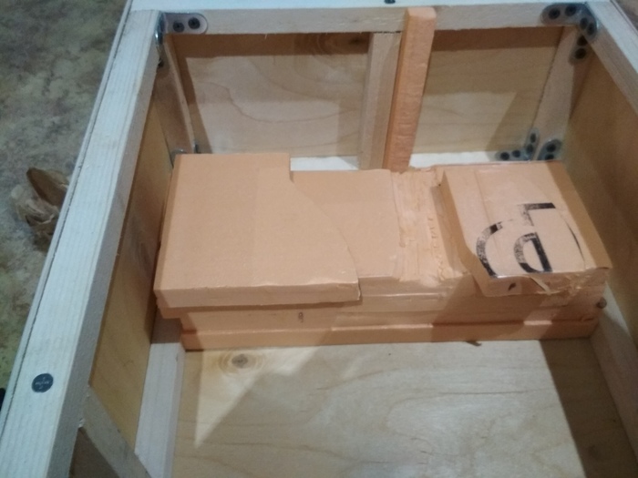 Затем определяем 4 точки, которыми крафт будет касаться стенок коробки, и вставляем туда пеноплекс таким образом, чтобы крафт перестал "гулять" внутри коробки.